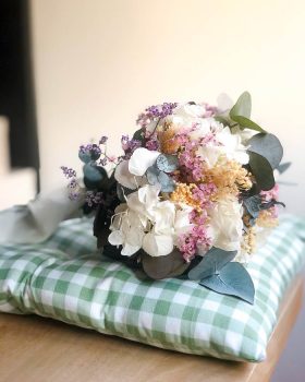 Este servicio no es apto para envíos. Por ese mismo motivo ni lo ofrecemos en la tienda online. Si eres una novia MARLAFRÁ y has diseñado tu precioso ramo de novia fresco con nosotros te adelantamos que te lo haremos llegar la misma mañana de la boda personalmente.