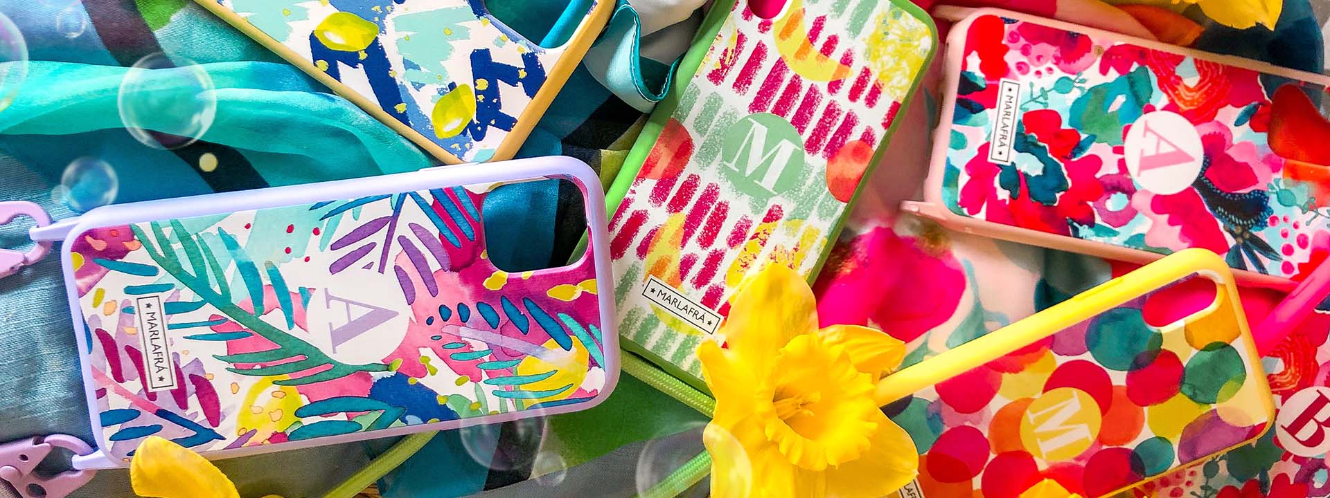Elige tu estampado, selecciona el color de borde + colgador y personaliza.
