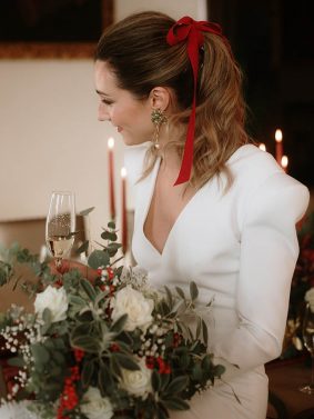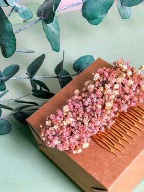 – Peinetas y tocados de flores a juego con el ramo de la novia o los tonos de vestido de las invitadas, madrina, o familiares y amigos.