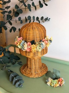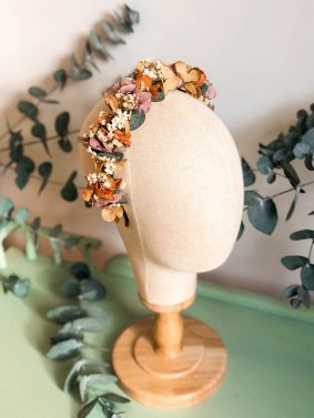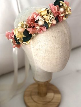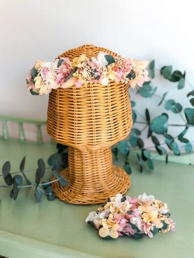 – Coronas de flores preservadas a juego con el ramo de la novia o los tonos de vestido de las invitadas, madrina, o familiares y amigos.