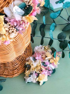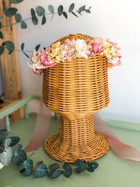 - Coronas personalizadas. Perfectas para regalos a amigas, hermanas, o familiares especiales. Personalizamos con su nombre y la decoramos con las flores más especiales de tu ramo y en los mismos tonos.